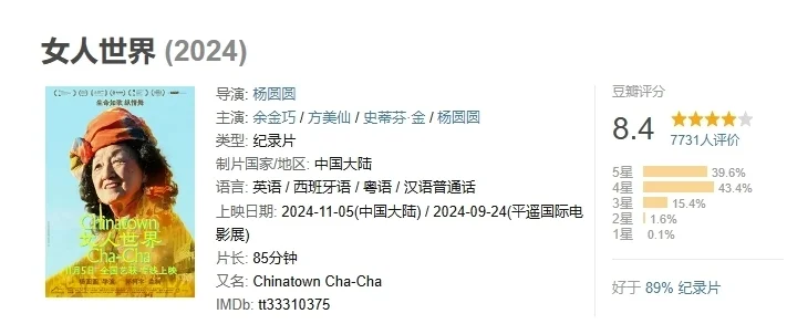 在夏天的电影点映场,看到柯比说这句话,我心中已经提前构想了一个故事——一个美国华裔,如何在华服与舞蹈里“想象中国”。11月5日,由杨圆圆导演的首部纪录长片《女人世界》全国上映,这是关于一群曾在唐人街跳舞的华人舞女的故事——柯比就是舞团的领舞。杨圆圆和她相遇时刚满30岁,柯比已经92岁,1980年代华侨返乡热期间,她曾经回过一次中国。