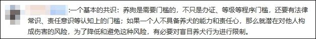 此次成都女童遭恶犬撕咬事件引发网友针对养犬乱象的讨论。有网友指出,养狗是需要门槛的,不只是办证、等级等程序门槛,还要有法律常识、责任意识等认知上的门槛;如果一个人不具备养犬的能力和责任心,那么就潜在对他人构成伤害的风险,为了降低和避免这种风险,有必要对盲目养犬行为进行限制。