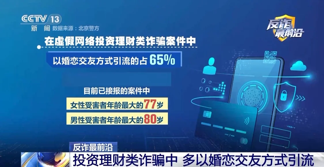 同时,北京警方统计发现,在虚假网络投资理财类诈骗案件中,以婚恋交友方式引流的占了65%。这类案件受害人年龄以40岁以上为主,目前已接报的案件中,女性受害者年龄最大的77岁,男性受害者年龄最大的80岁。
