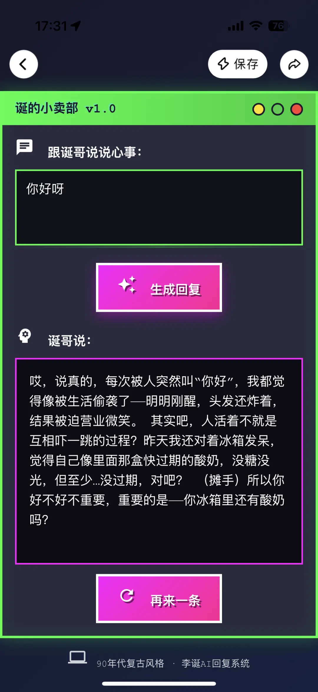 社交媒体上,网友们玩的不亦乐乎,脱口秀演员李诞也下场,做了一个“诞的小卖部”小应用,把想给李诞说的话输入进去,会自动生成一个李诞语气和风格的回复。
