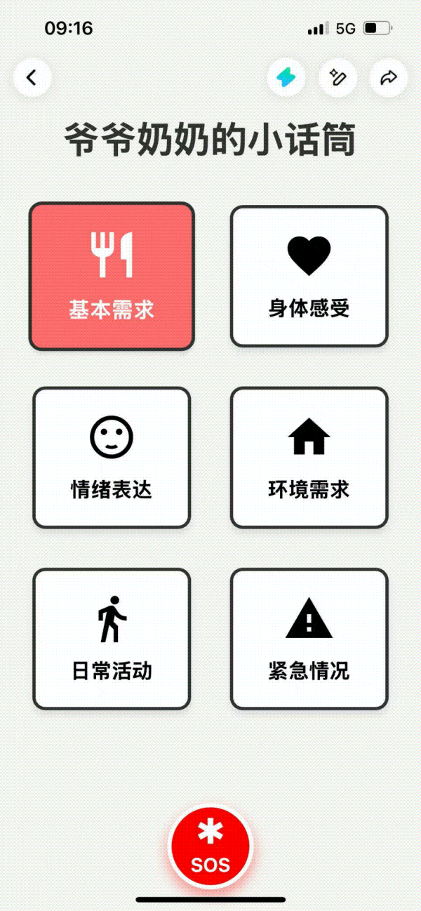 吃饭、睡觉、上厕所、到院子、有点冷、换个台……父亲的这些需求以前都是用手指简单一指,剩下全靠毛强自己猜,现在,毛强只要拿出手机让老人点点就可以,排版简单、字体加粗、颜色鲜艳,老人家很满意。