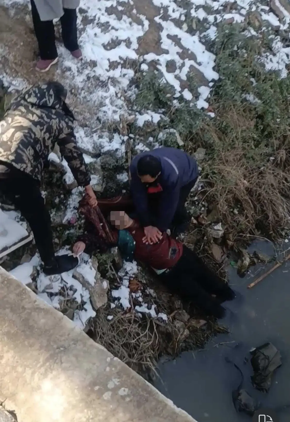 据网友发布的多段现场救援视频显示,有人骑电动车冲入河里,人车均已没入水中。一名穿工装的男子踏过岸边的积雪,率先下到冰冷的河水中开始摸索,先是捞起一些物品,随后摸到一只胳膊,另一身穿迷彩服的男子见状也赶紧下水,两人奋力将落水女子拉到岸边坡上,工装男开始按压为其做心肺复苏,因为坡度较陡,随后又有两人加入救援队伍,四人合力将溺水女子抬到坡上的路面,迷彩男又接着为溺水女子按压做心肺复苏。整个救援过程中,有人拨打了110和120,并报告了事发的具体位置。