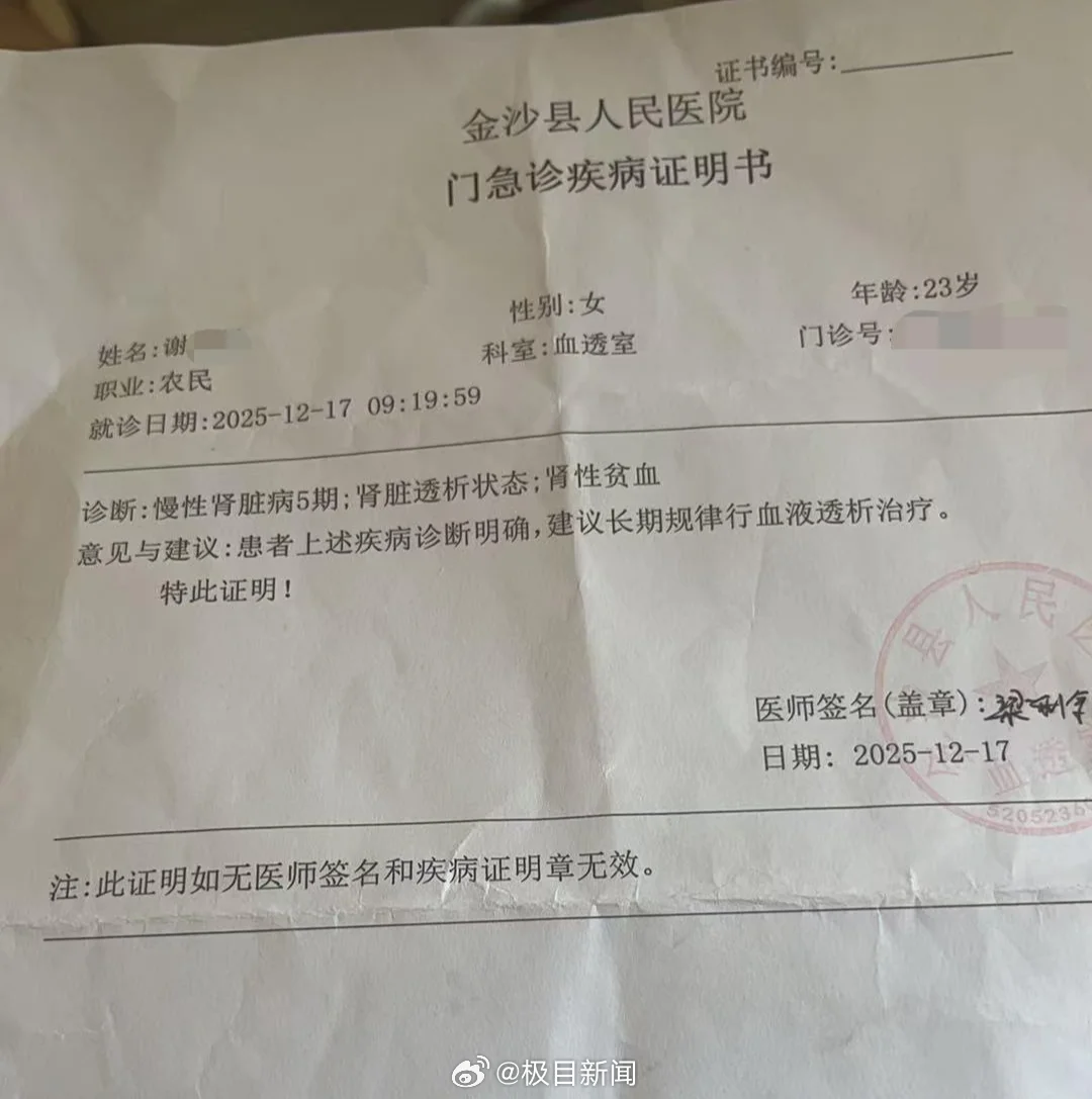 1月15日,极目新闻记者联系上博主“努力的小鱼”。小鱼(化名)回忆,高中时因父亲患有抑郁症、精神状态不佳,她选择辍学在家照顾。后来因爷爷奶奶年事已高,她外出打工补贴家用,却于2023年1月被确诊为尿毒症晚期。确诊后,小鱼回到贵州老家治疗。“当时家里没给我交医保,最开始全是自费,到处借钱。每周要做3次透析,一次500元。家里没钱,用的是奶奶的养老金。”她表示,后来奶奶到相关部门说明情况,医保顺利办下来,治疗压力才有所减轻。