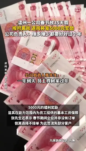1月14日,该公司负责人张先生在接受九派新闻采访时表示,其企业已办厂十余年,每年春节均采取类似放假安排。张先生介绍,公司外地员工较多,大家辛苦工作了近11个月,无论生产任务多忙,都会安排员工返乡过年、陪伴家人和孩子。5000元的福利奖励,是其在能力范围内为员工提供的基本工资保障。