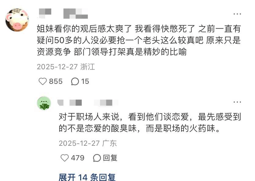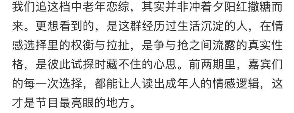 “追中老年恋综,不是冲着夕阳红撒糖来的……更想看他们在争与抢之间流露的真实性格”。