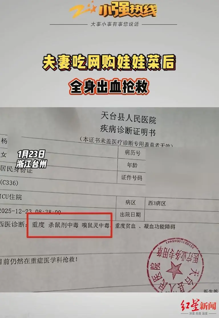 1月23日,浙江卫视科教频道小强热线节目报道,浙江台州天台县杨女士和丈夫于2025年12月网购娃娃菜,食用后夫妇俩同时出现全身出血症状,入院抢救。医院诊断结果显示,夫妇俩均为老鼠药中毒,杨女士丈夫血液中检测出杀鼠剂成分。随后警方也在网购娃娃菜中检测出老鼠药,并受案。