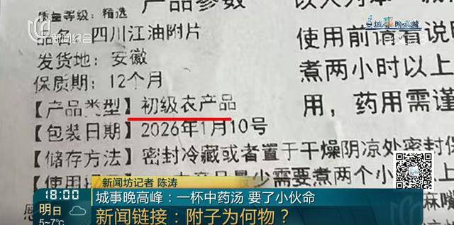 记者发现,夏先生购买的这包“四川江油附片”,外包装上产品类型标注的是“初级农产品”,因为附子本身是乌头植物的块根,地里采收的鲜附子,可以作为初级农产品进行交易,但它并不是可以直接用于临床的药品,必须经过一系列复杂、规范的炮制加工,将其毒性降低到安全范围,才能成为“中药饮片”。