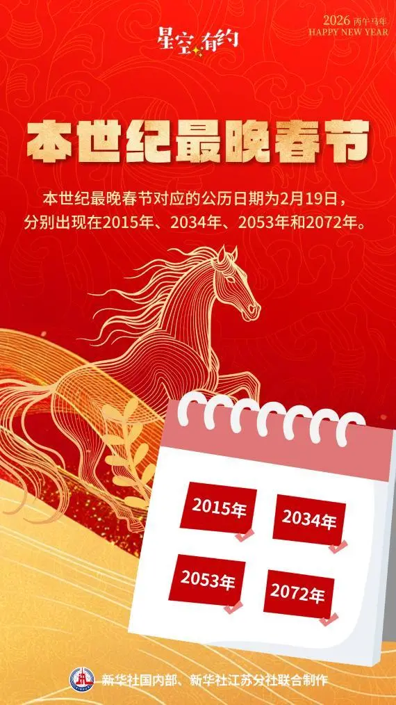新华社南京2月16日电(记者王珏玢、邱冰清)2月17日迎来丙午马年春节。翻开日历不难发现,相较于即将过去的乙巳蛇年(春节日期为1月29日),马年春节的公历日期推迟了近20天。这个春节为啥姗姗来迟?