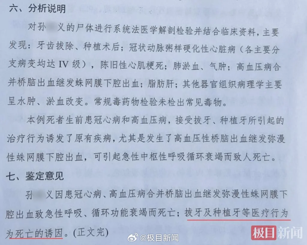 鉴定意见指出,孙某义因患冠心病、高血压病合并桥脑出血继发弥漫性蛛网膜下腔出血致急性呼吸、循环功能衰竭而死亡;拔牙及种植牙等医疗行为是死亡的诱因。
