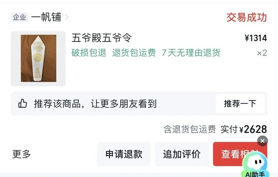 米女士的母亲就听信了直播间“主播被人做局,过得很不顺利,后来被大师救了”的故事,购买了两个1314元的“五爷令”和一个333元的“五爷牌”。“购物平台上同款只要十几块,这种东西也没办法鉴定真假,只能吃‘哑巴亏’”,米女士很生气。记者按照米女士提供的图片进行搜索,发现另一平台上“五爷令”价格在50元左右,“五爷牌”则只要10多元。马女士也告诉记者,父亲在直播间以100元的价格购买的吊坠,自己在另一平台搜索同款只要2.5元。
