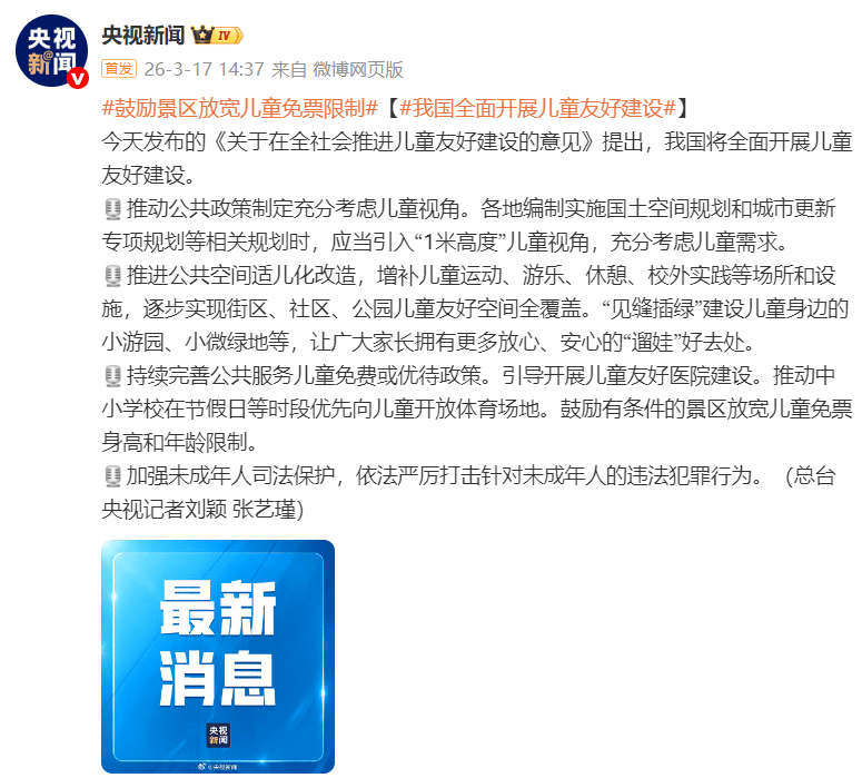 儿童友好建设措施公布:放宽免票限制、满13周岁女孩免费接种HPV、推行免费学前教育