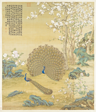 另据清代内务府造办处档案记载:乾隆二十三年七月十二日,乾隆帝下旨:“着郎世宁画开屏孔雀大画一轴,补景着方棕、金廷标合笔,用白绢”,绘画地点为如意馆。