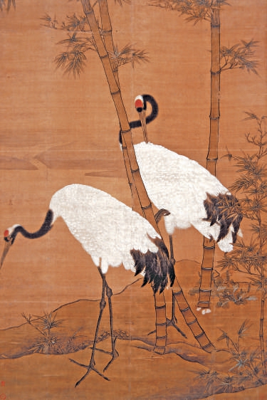 边景昭是明代宫廷画师,永乐年间被召入宫中。他绘有多幅宫廷写实花鸟画,《竹鹤图轴》绘制的就是宫中的两只仙鹤。画面中,一对仙鹤姿态优雅,轩昂高洁,在翠竹间怡然自得。画中鹤羽用极细的淡墨线“丝毛”(中国画传统技法,指通过毛笔、刷子等工具表现人物头发、动物皮毛及鸟类羽毛的表现手法),再以白粉多层积染,表现出羽绒的蓬松感和层次感。鹤顶用厚重的朱砂点出,色泽鲜艳沉稳,不晕不散。鹤腿用刚劲流畅的线条勾勒,转折有力。