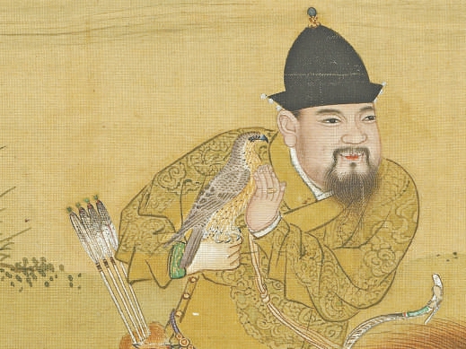 明代宫廷绘画中,有一幅《明宣宗马上像轴》,描绘了一片辽阔的草原上,明宣宗(宣德帝)狩猎的场景。他身着交领右衽黄袍猎装,头戴带有顶珠的帽子,背挎镶貂鼠箭筒,策马奔驰于河边芦苇地带,惊起前方群雁。细看宣德帝胸前,右手架着一只猎鹰,左手还轻抚鹰的前胸,似乎要提示它准备攻击猎物。