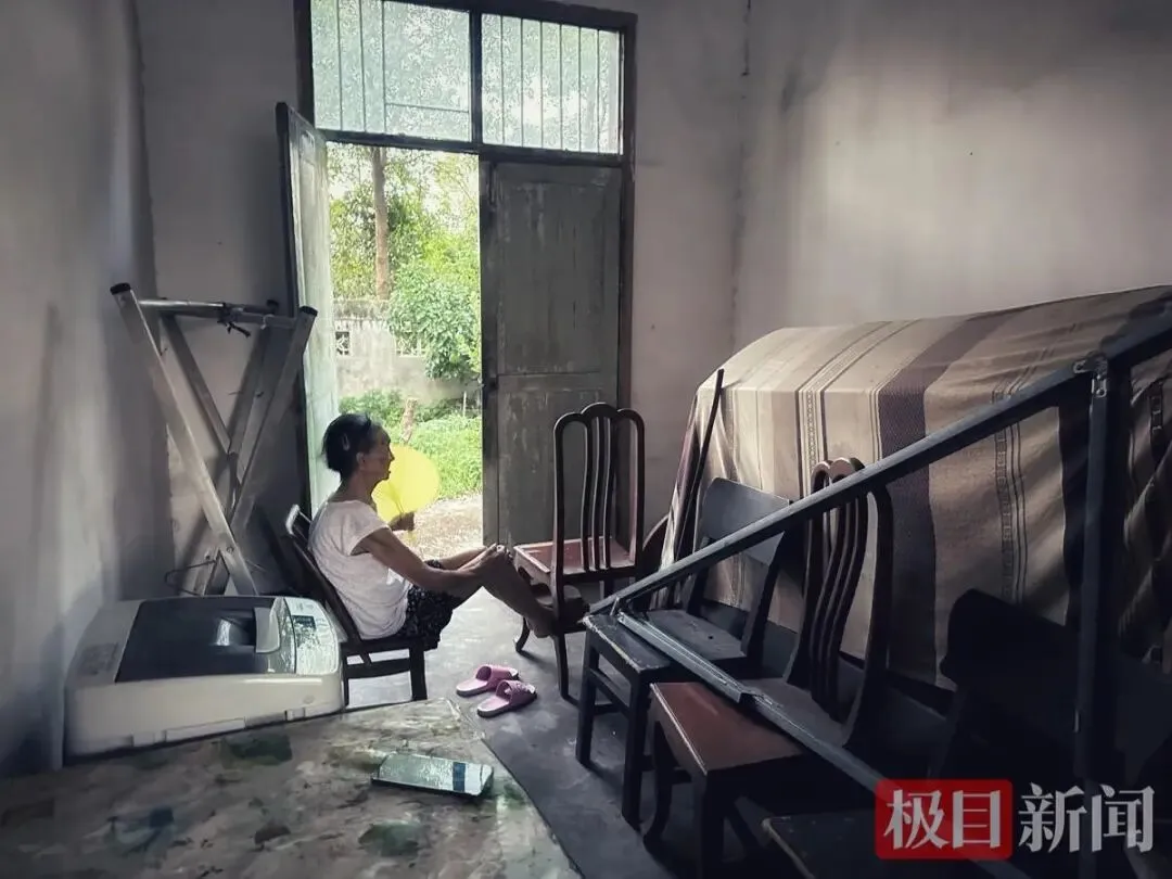 2025年7月30日,唐奶奶坐在客厅乘凉。她的面前是一口用布盖着的棺材。(摄影 梁涛)