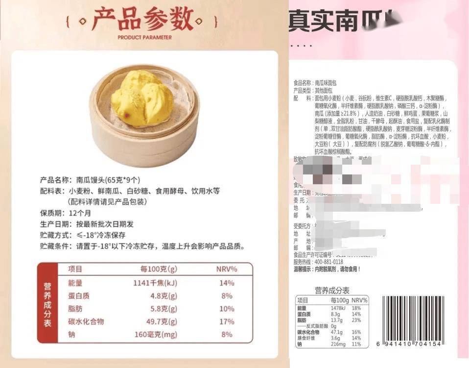那么,在所用食材差不多的情况下,花样面包和花式馒头,哪个在营养方面更胜一筹呢?我们试着对比一下南瓜面包和南瓜馒头。