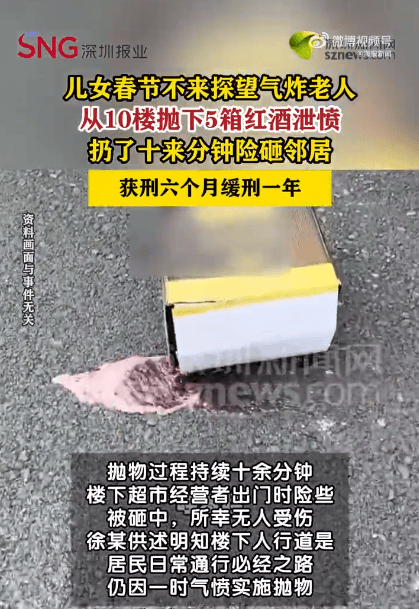 不满儿女春节未探望,老人将子女存放家中的五箱红酒从十楼抛下,有人险被砸,法院判了