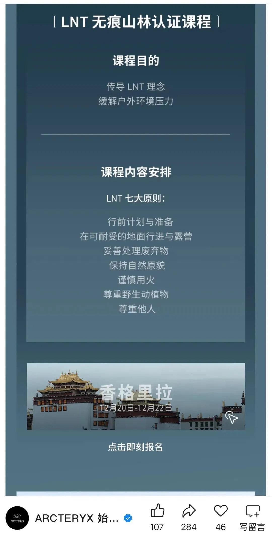 无痕山林(Leave No Trace,LNT),简称LNT,是始于美国的一种户外运动方式,旨在提醒人们在自然中活动时,关注并身体力行地保护与维护当地的生态环境。据始祖鸟官方微信公众号信息,其去年底还在香格里拉开展过相关课程。