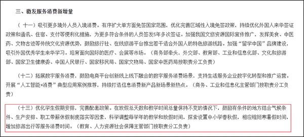 9月16日,商务部等九部门发布《关于扩大服务消费的若干政策措施》,其中就提出,要在放假总天数和教学时间总量保持不变的前提下,优化学生假期安排,完善配套政策。文件鼓励各地根据气候条件、生产安排和职工带薪休假落实情况,科学调整学年教学与放假时间,探索设置中小学春秋假,并相应缩短寒暑假时间,以增加旅游出行等服务消费机会。