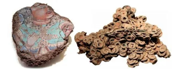 左图:图木舒克市附近一处佛寺遗址内的壁画残块,唐代;右图:龟兹五铢钱,汉代。图/视觉中国 新华