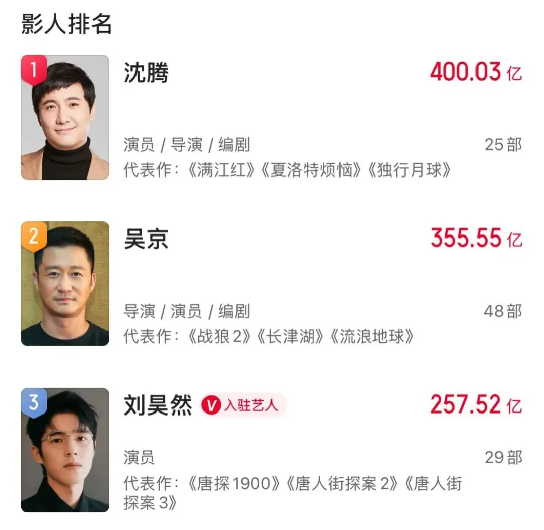 随着《飞驰人生3》票房日日攀升,沈腾于今日成为首位票房“400亿+俱乐部”成员,而排在他之后的吴京,也拥有傲人的355亿票房战绩。刘昊然、黄渤、张译暂列中国男演员累计主演电影票房榜第三至第五。