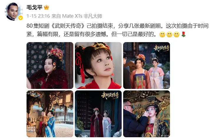 去年,刘晓庆进军短剧赛道,用6天时间拍完首部短剧《萌宝助攻:五十岁婚宠》(57集)。今年1月,她又用9天时间拍完80集短剧《武则天传奇》,并再次与毛戈平合作。