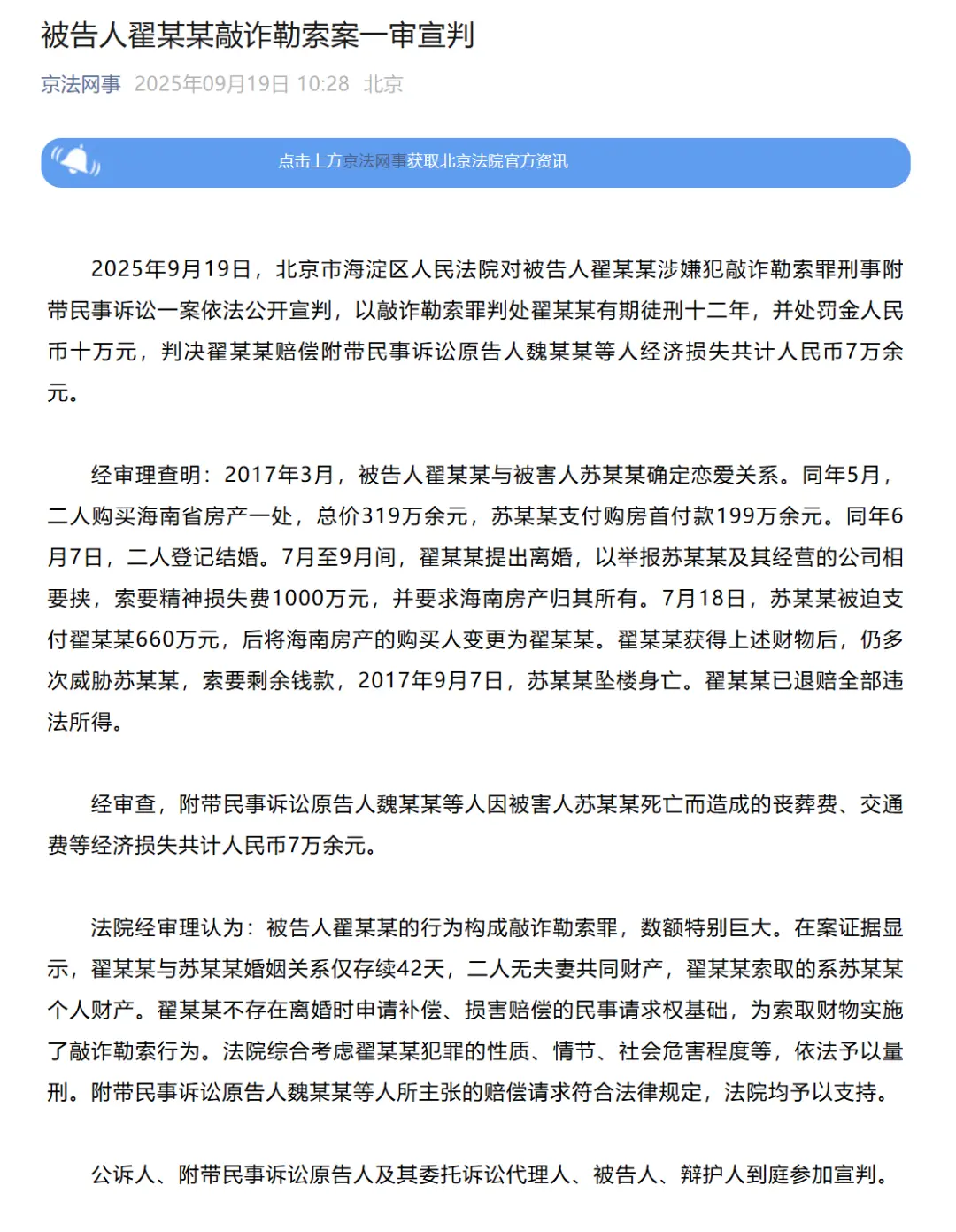 9月19日上午,北京市海淀区人民法院对被告人翟某某涉嫌犯敲诈勒索罪刑事附带民事诉讼一案依法公开宣判,以敲诈勒索罪判处翟某某有期徒刑十二年,并处罚金人民币十万元,判决翟某某赔偿附带民事诉讼原告人魏某某等人经济损失共计人民币7万余元。