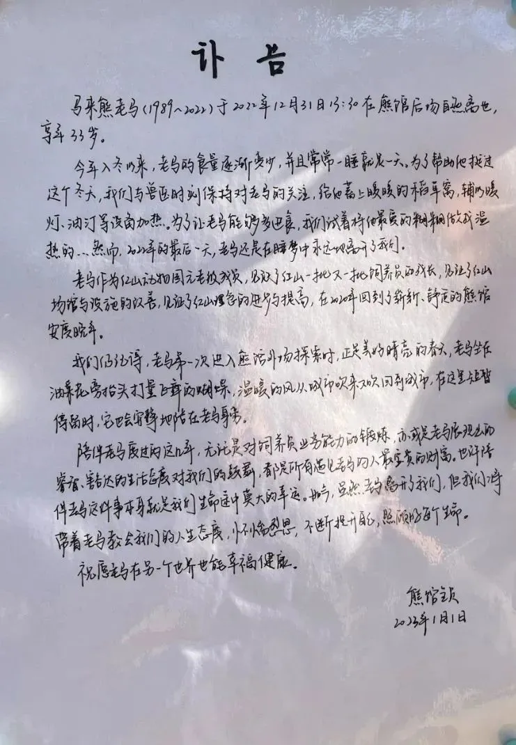 △老马的讣告由照顾过老马的熊馆员工集体撰写。