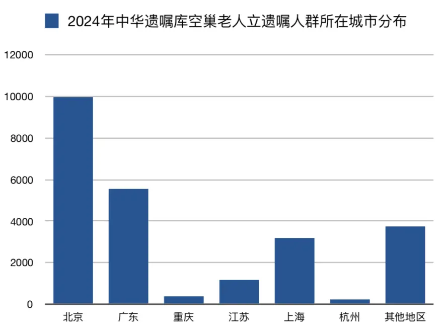 此外,2024年在中华遗嘱库订立遗嘱的空巢老人中,北京、上海、广东地区的总量占比达77%。近几年,在全国推广遗嘱观念过程中,陈凯也发现,一线城市对立遗嘱的观念在快速改观。