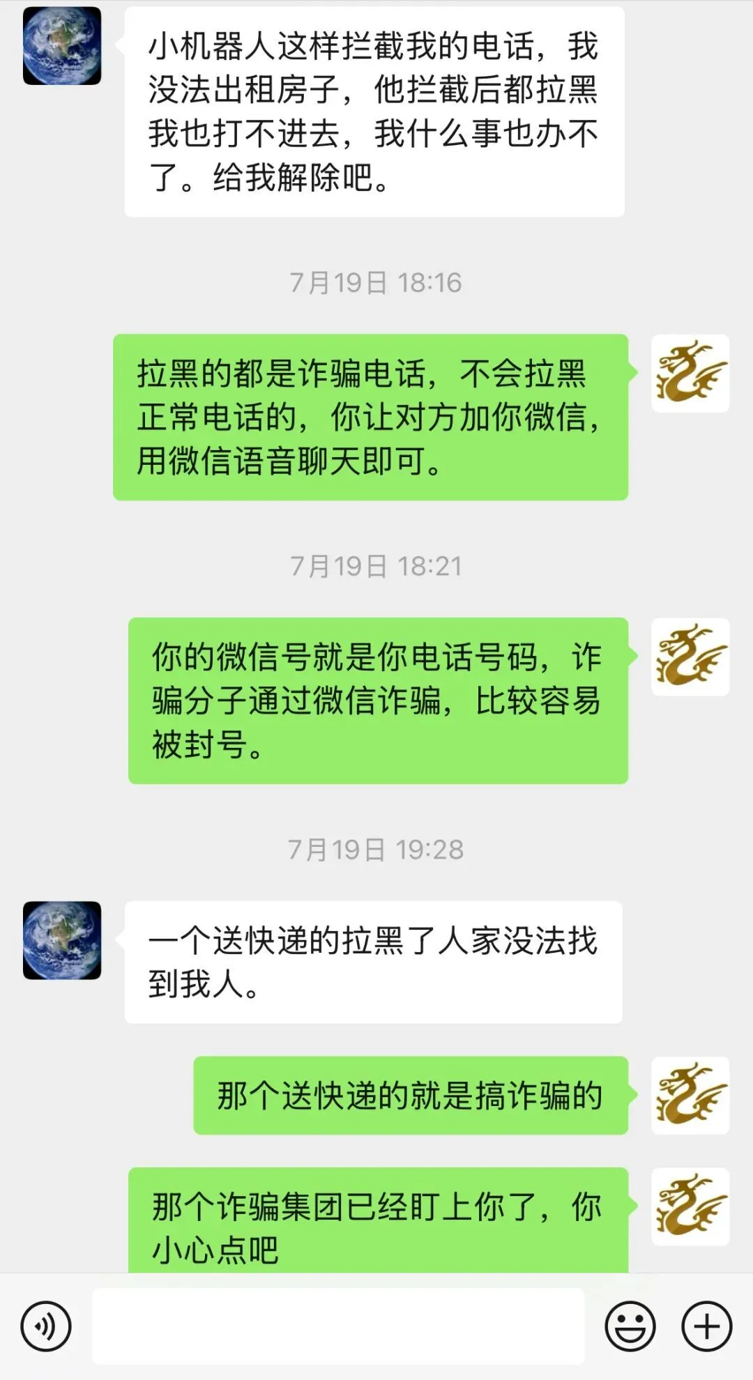 7月19日,我妈妈在微信里对我说,我设置的拦截电话让她没办法出租房子,让我解除,我说让她通过微信的方式联系租客,并警告那个诈骗集团已经盯上她了,让她小心一点。