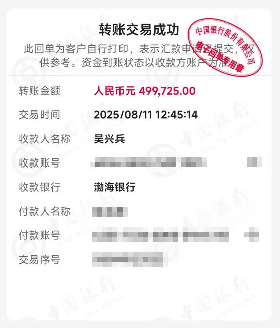 8月11日12时26分,以及8月13日12时27分,骗子“陈科长 ”又和我妈妈进行视频通话了两次,在这两次视频通过的时间里,我妈妈银行卡里的95万元被三次转账到骗子的账户里。
