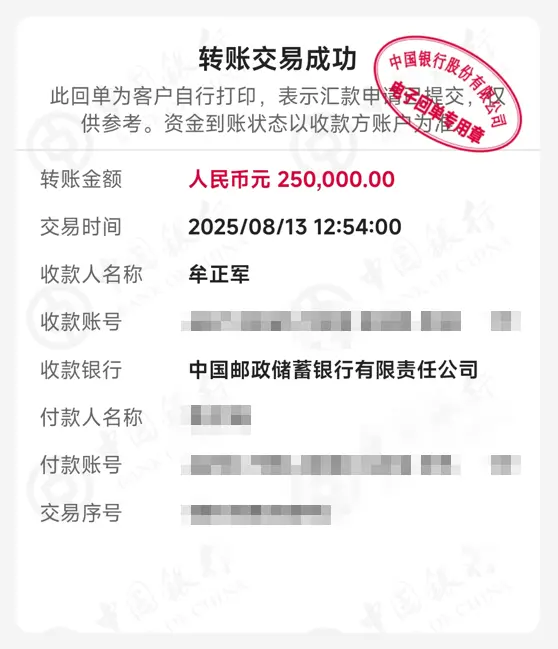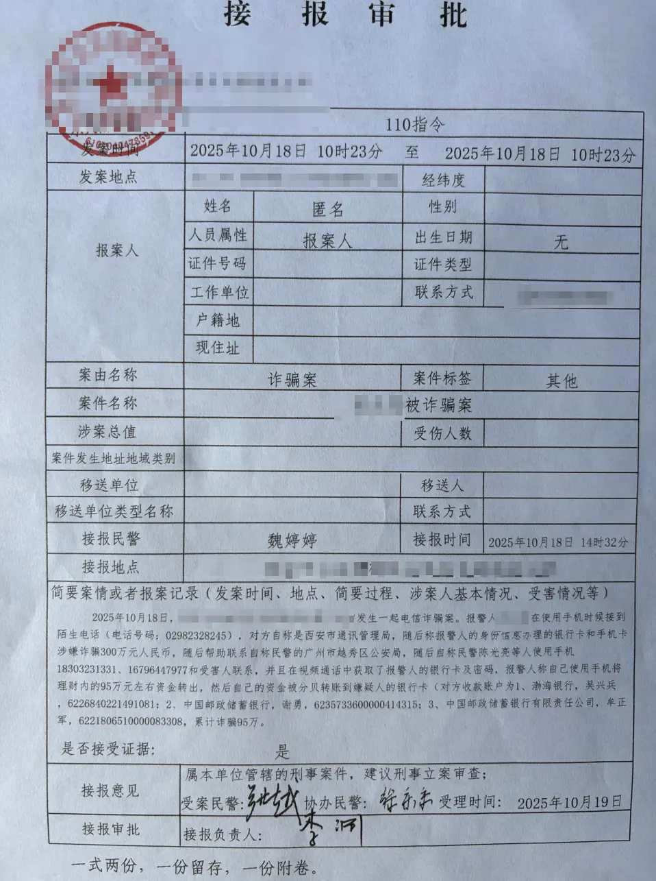 8月11日和13日,骗子将我妈妈银行卡的95万元分三笔转到骗子的银行卡。