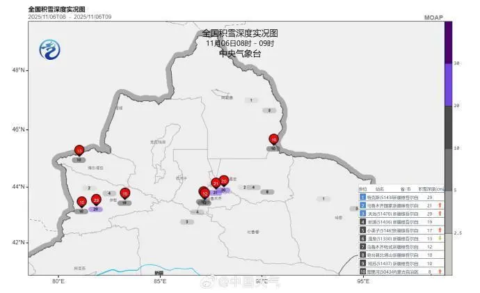乌鲁木齐11月5日10时至6日9时降水量(图片来源:中央气象台)