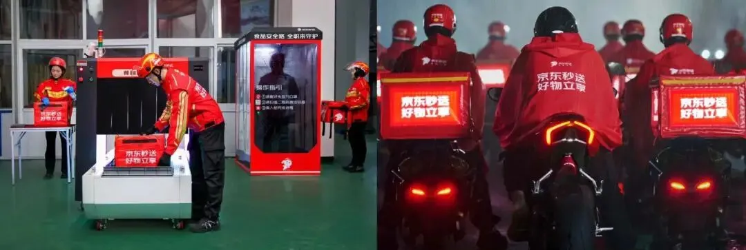 京东外卖的骑手服以亮眼的红色为主色调,胸口与手臂点缀金色线条,红金撞色在街头场景中格外吸睛。两个月前,平台更给全职骑手配齐了红色雨衣,官方称这是“雨天酷炫的时尚单品”。