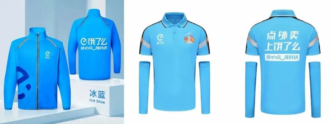 除了新上线的饿了么城市骑士专属制服采用了高饱和度的橙色,饿了么旧款工装也是较高饱和度的蓝色,它以冰蓝色为主色调,外套、polo短袖后背印有品牌名称及标语,同时肩部位置还有银色反光条。