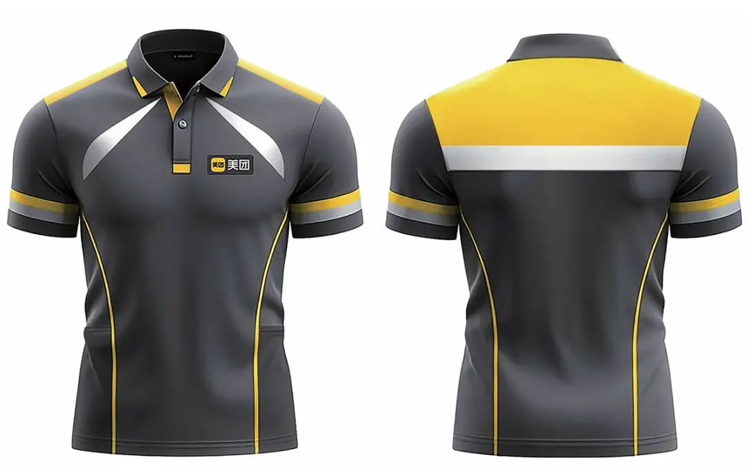 不过美团外卖今年的夏装polo短袖大面积减少了黄色,整件衣服以灰色为主,但黄色元素还是被留了下来,尤其后背部分较为明显。