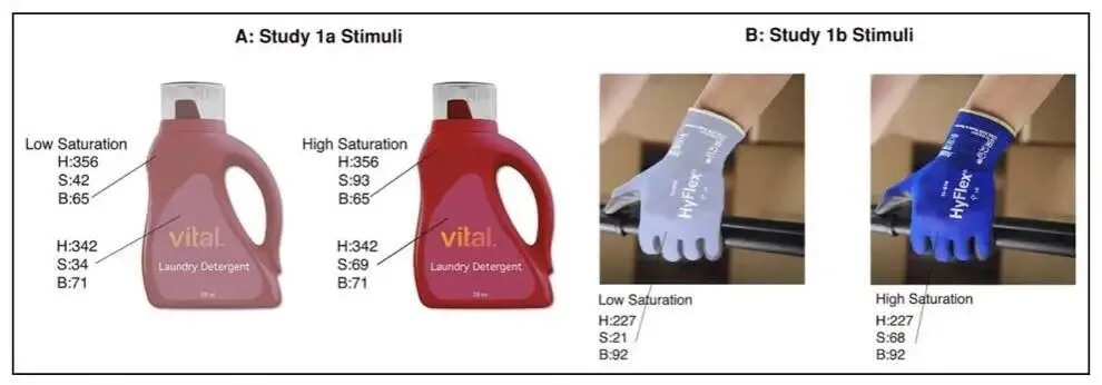 实验选取了消耗性产品(洗衣液)以及耐用品(工作手套)不同色彩饱和度的图片,让人们评估产品的功效和购买意愿。结果发现,人们认为颜色越鲜艳的产品效果越强,他们也会更愿意购买色彩鲜艳的产品。