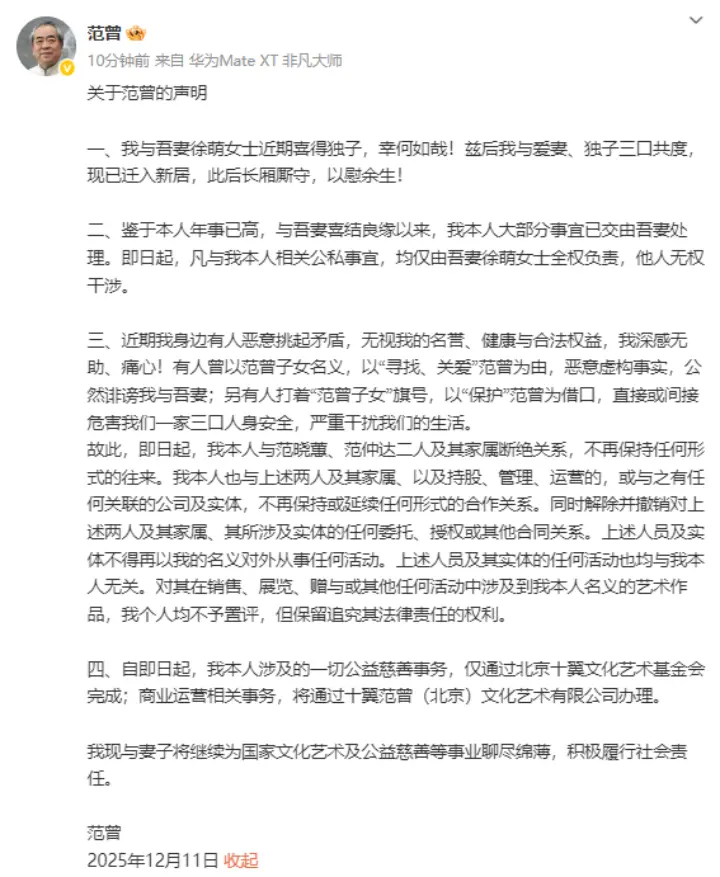 12月11日,书画家范曾公开回应“失联风波”,发布声明宣布与女儿、继子断绝关系。