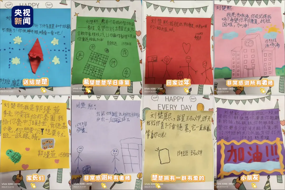 除了录制视频 同学们还亲手制作了祝福贺卡 祝愿楚熙早日醒来