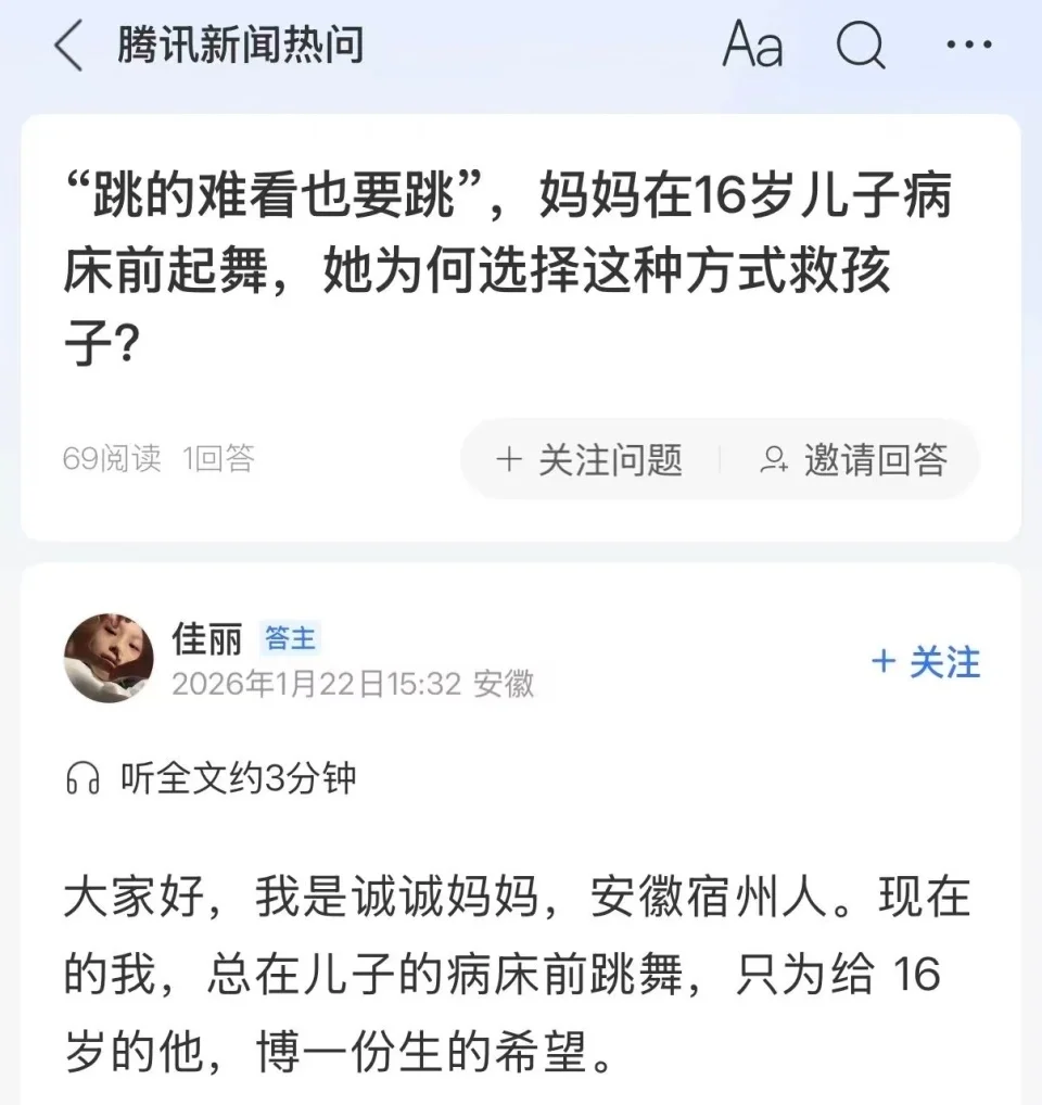 病房里,37岁的诚诚妈对着手机镜头,略显笨拙地摆动身体……她身后,是偏瘫在床、罹患T淋巴母细胞白血病/淋巴瘤的16岁儿子。一千多公里外,24岁的小刘在透析间隙对着镜头舒展身体,动作流畅专业,他曾是舞蹈老师,如今与尿毒症抗争,跳舞成为他“攒钱换肾”的最大希望。