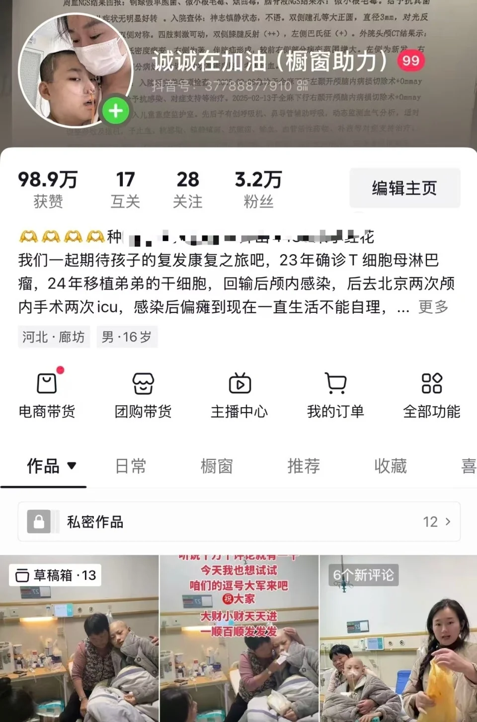 诚诚妈说,为给孩子治病,他们卖了车,掏空积蓄,四处借钱,银行贷款……能想的办法都想了,但面对诚诚严重的病情,他们此前所做的努力都如同徒劳,直到她意外发现,在网络平台直播能获得收入。此后,跳着不熟练舞蹈的母亲,和躺在病床上虚弱的诚诚,便成了娘俩网络账号更新的日常。而网友的捐款和通过卖货获得的帮助,便成为这个家庭为诚诚“续命”的微光。