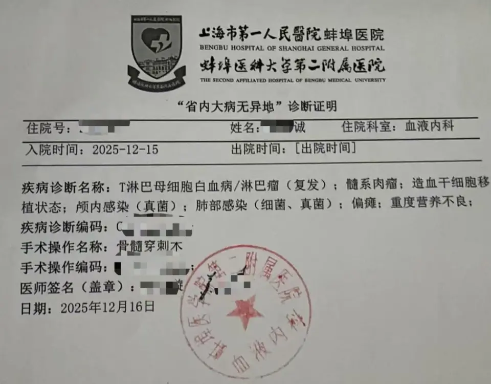 诚诚妈回忆,他们是安徽宿州一户普通的农村家庭,原本打算平淡幸福地奔向有希望的未来,但2023年11月,一切都发生了变化……她16岁的儿子诚诚被确诊为T淋巴母细胞白血病/淋巴瘤。原本活泼爱笑的少年,经历化疗、放疗、CAR-T治疗、干细胞移植后,又因颅内感染导致左侧偏瘫,如今“生活已不能自理,严重时连话都说不出来”。