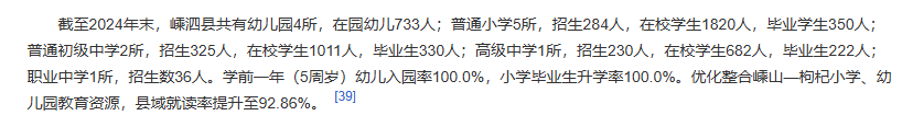 我们再看看这个县的教育情况:幼儿园4所,人数733人;普通小学5所,招生284人;普通初中2所,招生325人;普通高中1所,招生230人;职中1所,招生36人。