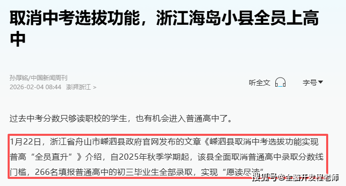 其实,在2026年1月22日,浙江舟山嵊泗县,已经公宣取消【中考选拔功能】,可以全员上高中。这个消息,着实掀起了一番浪潮,很多人开始兴奋,似乎“取消中考五五分流”就在眼前。