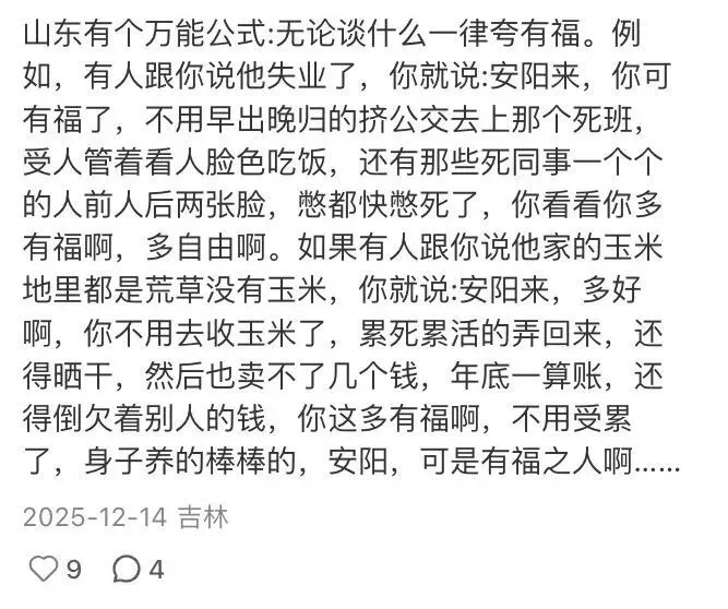 而现在,在互联网的玩梗下,”那你享福了”像是用一个标准答案去套所有题,比起安慰更像是一种“高情商”下的敷衍。