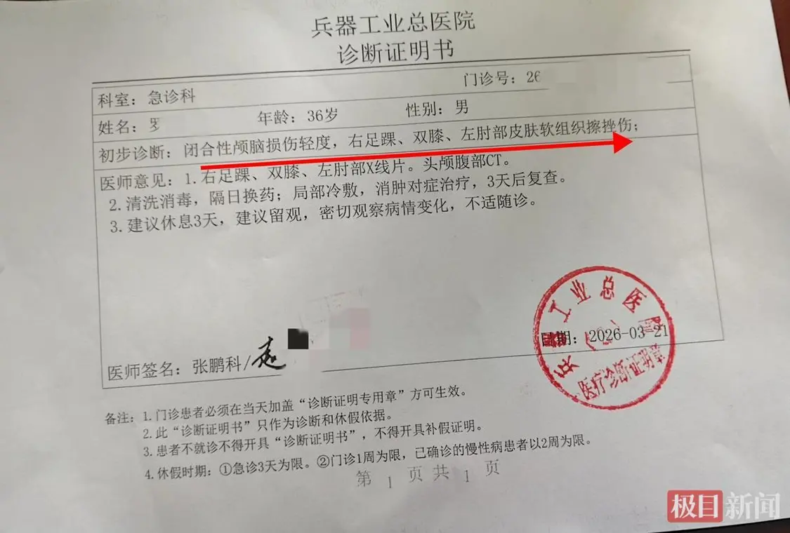 此次冲撞导致罗某受伤,他提供的医院诊断证明显示:轻度闭合性颅脑损伤;右足踝、双膝、左肘部等部位皮肤软组织擦挫伤。所幸,罗某的三名同伴及现场其他市民均未受伤。
